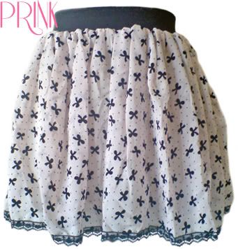 กระโปรงสีขาวลายโบว์ ติดระบายลูกไม้สีดำที่ชายกระโปรง เอวยางยืด มีซับใน ยาว 14"