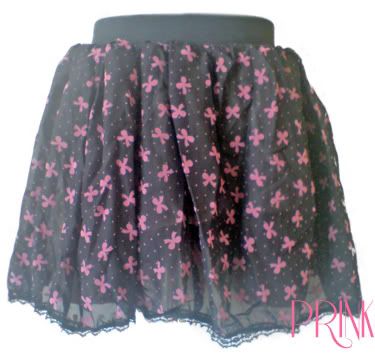 กระโปรงสีดำลายโบว์ ติดระบายลูกไม้สีดำที่ชายกระโปรง เอวยางยืด มีซับใน ยาว 14"